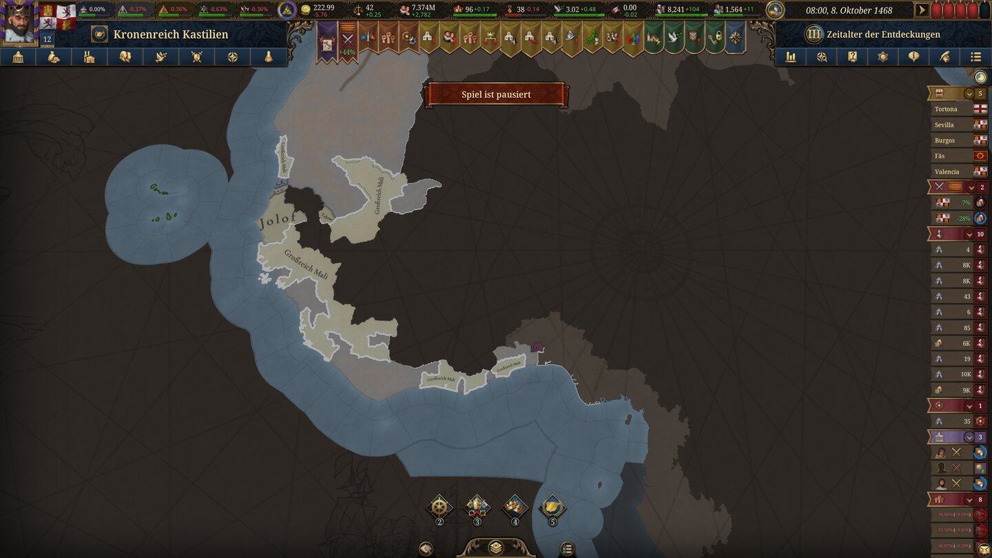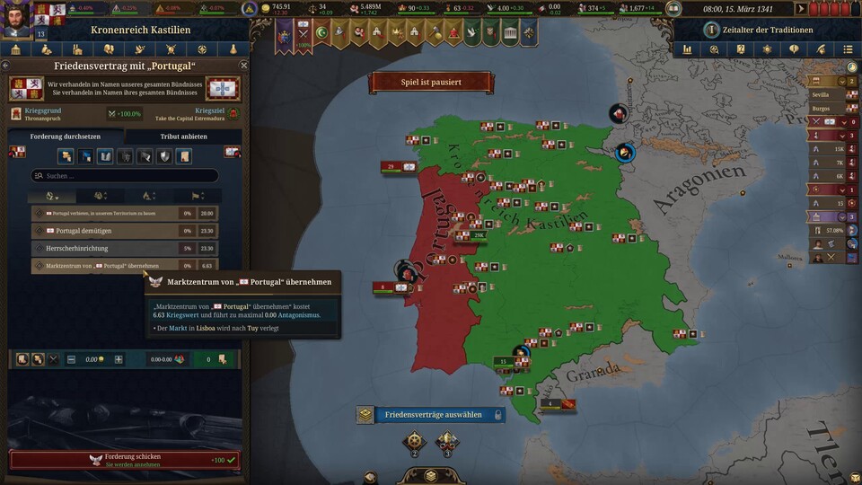 Und bei meinem dritten Versuch mit Castile kamen auch noch neue Bugs hinzu. Beispielsweise ist der Fall des Erbfolgestreits inzwischen gescheitert. Wenn ich Portugal den Krieg erkläre (wie im Gameplay-Video), erscheint die entsprechende Option bei den Friedensverhandlungen einfach nicht mehr.