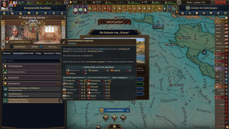 Das Konzil von Trient stimmt derzeit ab. Das Fenster „Situation“ auf der linken Seite scheint zu zeigen, dass die Hexenverfolgung befürwortet wird.