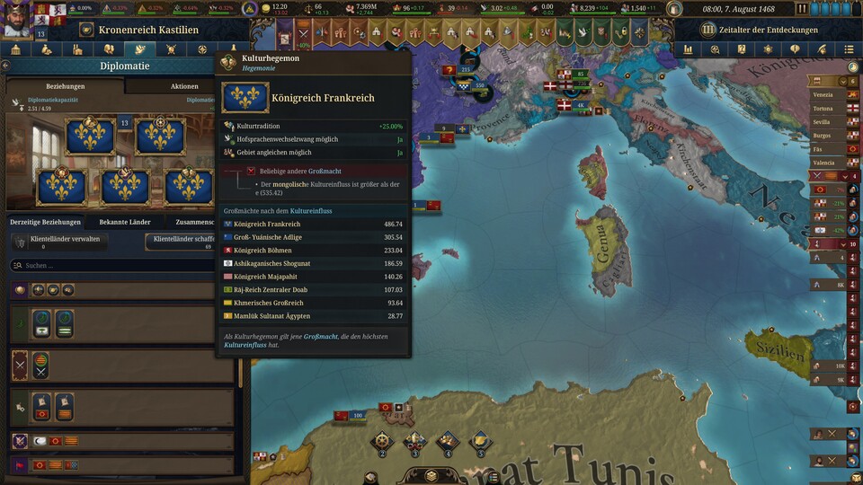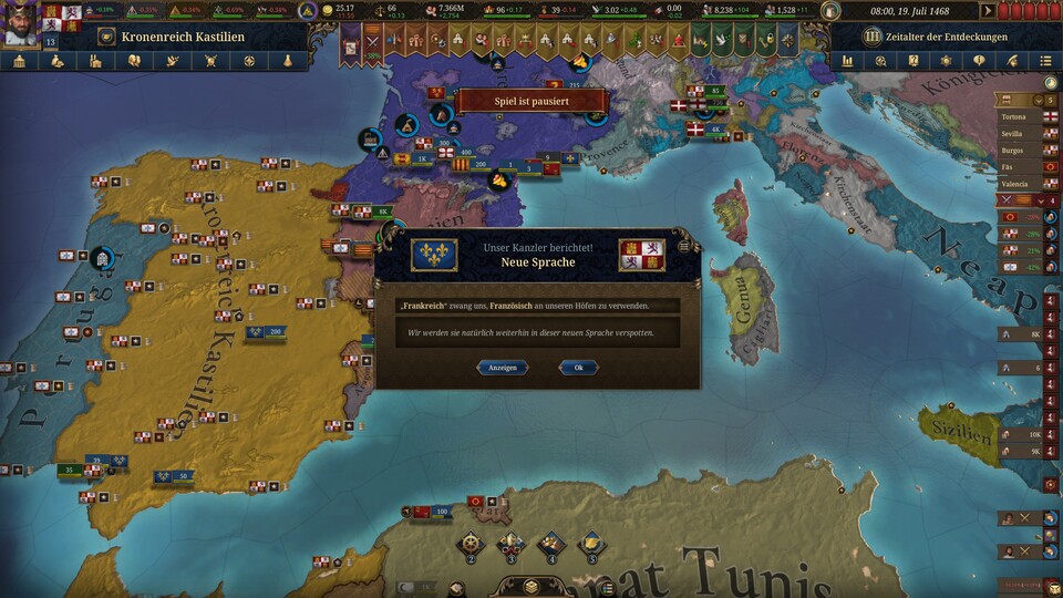 Das ist sowieso ein absurdes Spielkonzept, bei dem mich Frankreich als Top-15-Nation der Welt regelmäßig dazu zwingt, ein Handelsembargo gegen Nachbarn zu verhängen oder sogar meine Gerichtssprache von Spanisch auf Französisch zu ändern. Und ich kann nicht einmal ablehnen! Der KI ist es egal, dass wir jetzt eine Allianz haben.