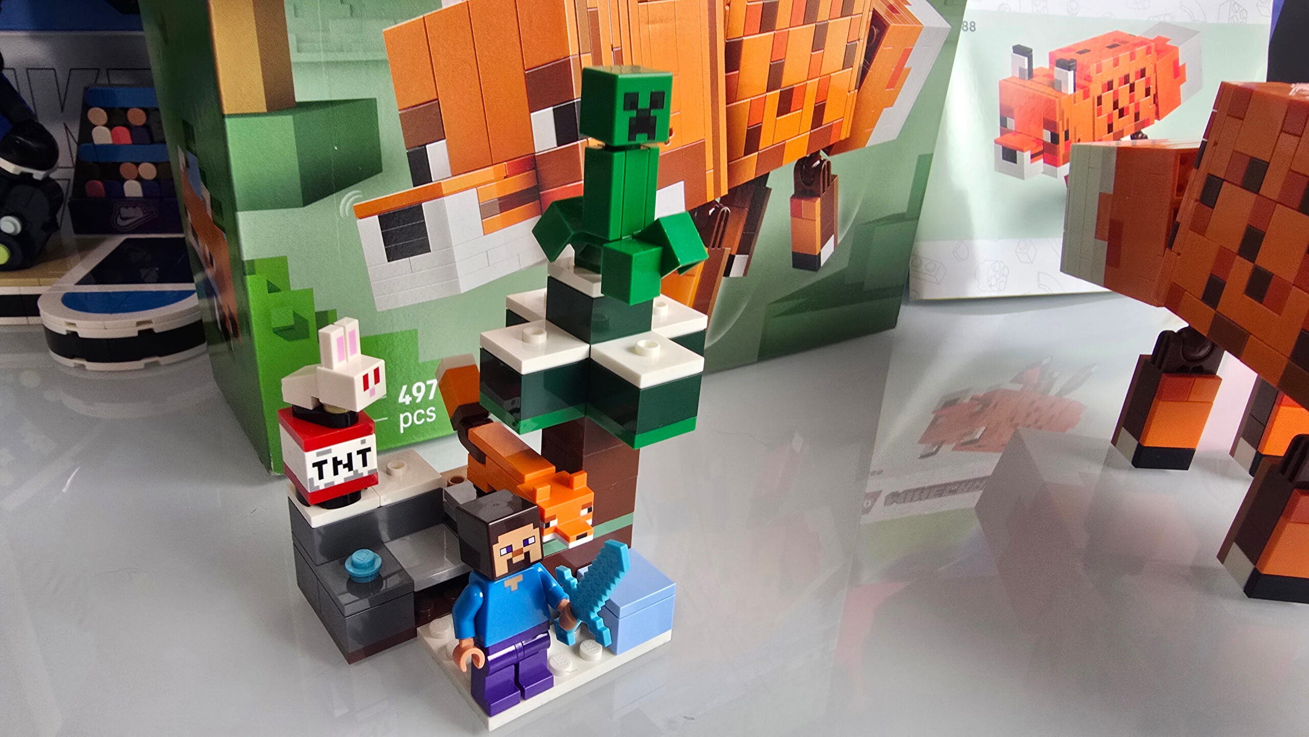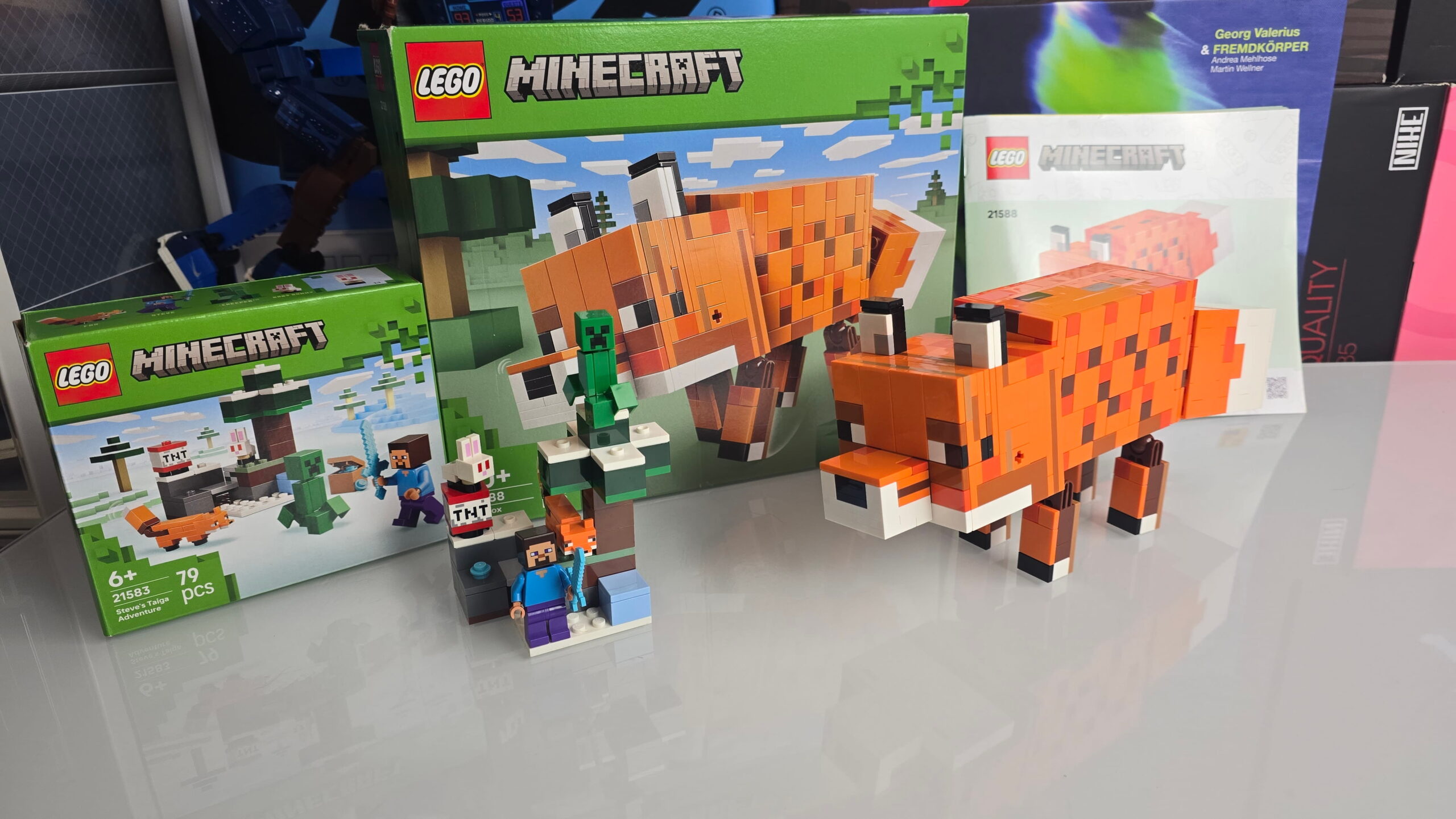 Die Sets fangen den typischen Minecraft-Look sehr gut ein. Vor allem der Fuchs wirkt als Ausstellungsmodell überraschend hochwertig.